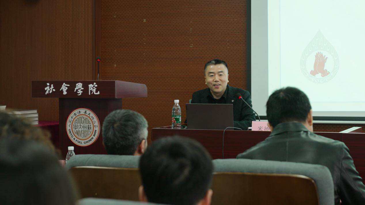 随后,大足石刻研究院大足学研究中心主任、历史学博士米德昉带来讲座“唐宋历史中的雕塑艺术——大足石刻图像谱系”。他以大足石刻的图像谱系为切入点,系统梳理了北山、宝顶山等“五山”造像的艺术突破与独特视角,从历史背景、艺术特色、文化内涵等多个角度,深入阐述了大足石刻在唐宋雕塑艺术发展中的重要地位。通过丰富的图片和实例,生动地展示了大足石刻的精美造像和深刻内涵,让苏大师生对大足石刻有了更加深刻的理解认识,领略到了大足石刻的独特魅力。