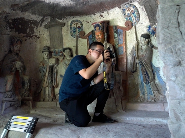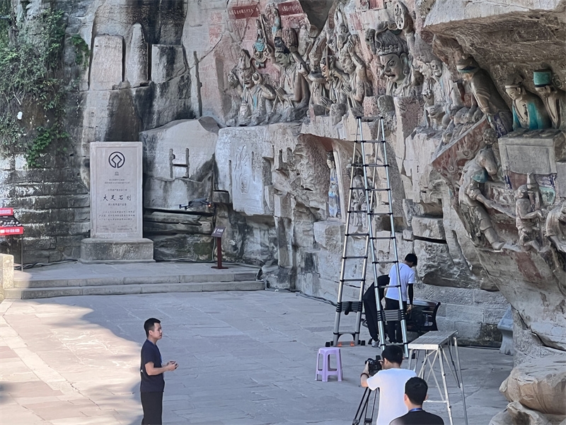 大足石刻作为世界文化遗产,代表着公元9—13世纪世界石窟艺术的最高水平。在新时代新语境下,如何让大足石刻活起来,是大足石刻文物保护利用工作的重要内容。随着科技的发展和展示手段的迭代更新,近年来不断尝试利用前沿数字化技术与大足石刻艺术之美高度融合,给观众完美呈现一场影像视觉的饕餮盛宴。2022年,新规划的大足石刻数字展示接待中心建成投用,以最新影像制作技术拍摄的一部球幕电影《大足石刻》正式上线。影片拍摄方式采用实景拍摄、历史场景的情景再现拍摄和类实景拍摄相结合,特别是“类实景拍摄”,它把真实的现实空间转换成数字空间,然后再用电影方式进行拍摄。这是一项前沿的拍摄方式。因此,8K球幕主题电影《大足石刻》是对大足石刻艺术价值主题的真实表达,是严格意义上的主题电影艺术风格。球幕影院占地1300平米,首次将杜比全景声(DolbyAtmos)与8K高分辨率球幕相结合,创造出包围感、临场感、环绕感更好的球幕空间,整个声音效果配合360度全景画面,各种环境声包含在周围,使观众真的好像走入洞窟,感受由全方位声音带来的别致画面感。球幕电影中的绝大部分素材都来源于大足石刻真实的文物数字化复原成果,它是通过遥感测绘、计算机图形技术等各类新型技术对文物本体的高精度三维复原。数字化复原技术在影视行业的应用,特别是石窟寺展示的应用上,还鲜有相比者。通过项目对数字化成果的二次处理并应用,大足石刻的无数精美塑像通过电影语言逐一地展示出来,甚至比在石刻现场看到的文物本体还要清晰、完整。